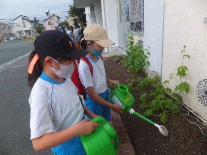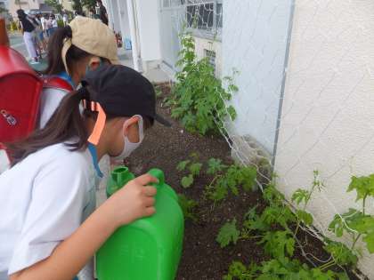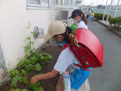 4年生は、ツルレイシに水やりをしていました。このときはこの大きさでした。そのツルレイシが、今はあんなにも立派に成長したのですね。