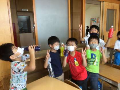 ペットボトルに入った色水を見つけ、「はい、ポーズ」。来週の図工の時間に、作ります。