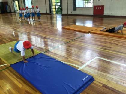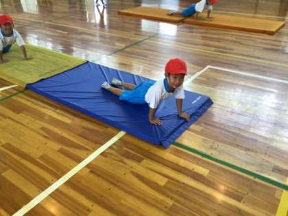 マット運動をしました。いぬやうま、あざらしになりきってみたり、かわとびでマットを飛び越えてみたりしました。