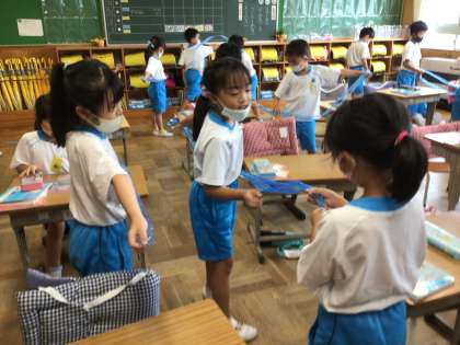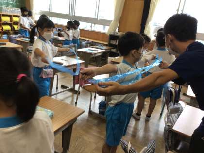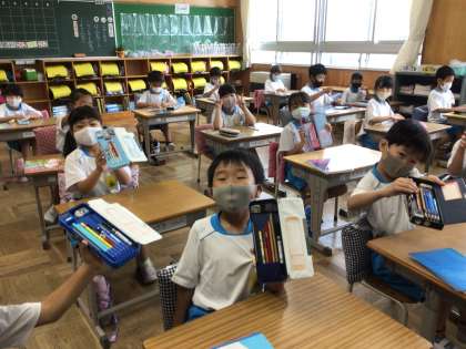 「おおきさくらべ」の学習で、長さを調べました。友だちと、くらべっこをしました。はしとはしをそろえる方法に、気がつきました。