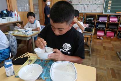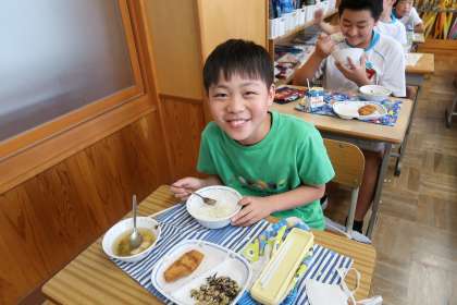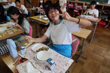今日の給食の様子です。マスクを外すので無言で食べています。広報委員会の放送を聞きながら笑顔で食べています。食べ終わり、食器を片付けるときにはもうすでにマスクを着けています。