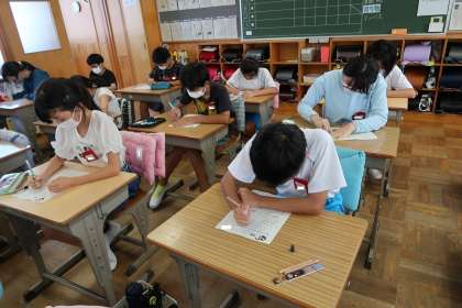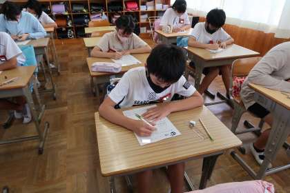 音楽の授業の様子です。授業の始めに、小テストを行っていました。