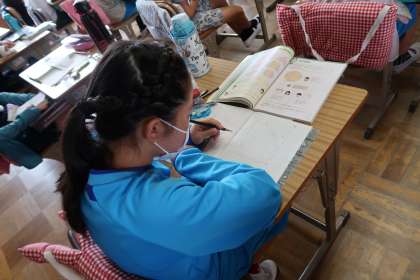 算数の授業の様子です。円のおよその面積を求めていました。円の4分の1の大きさのおおぎ形を利用して考えていました。