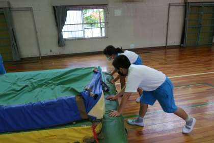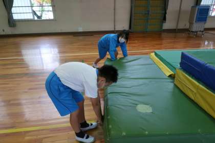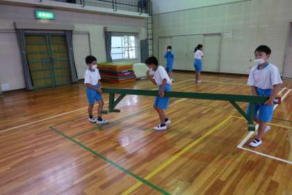 登校後に、5年生がお手伝いをしていました。体育館で体育の準備をしていたのです。素敵ですね。