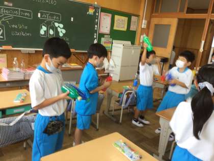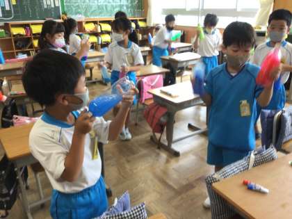 好きな色に、お水を入れてシャカシャカふりふりしています。とっても楽しそうですよ。