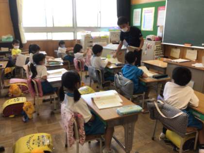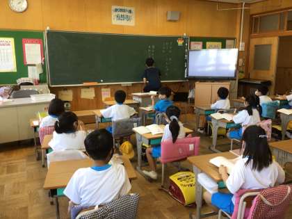 「ことばあそびうた」をたかね先生と学習しました。前回の振り返りをしながら、進めました。きょうは、動物に関係する音を探して、言葉を集めました。