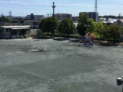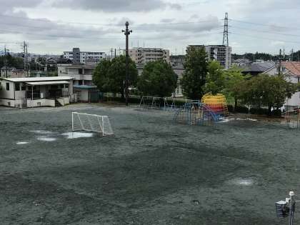 運動場の水たまり。水はどこへいってしまうのでしょう…。