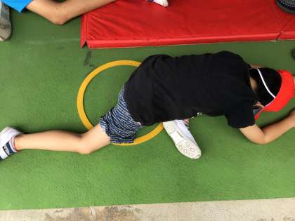 輪くぐり競争をしました。体をぐねぐね曲げながら、目の前の輪をくぐりました!