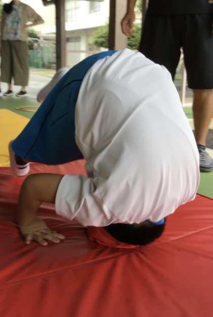 前転の練習をしました。練習を重ね、まっすぐ転がることができ、大喜びでした!