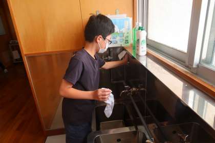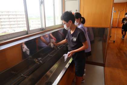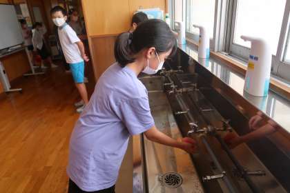 東手洗い場の清掃活動です。1組が担当しています。毎日、きれいに掃除をしてくれています。ピカピカ光っています。