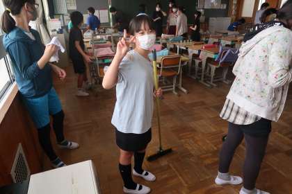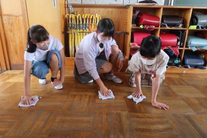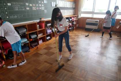 1組の教室の清掃活動です。元気よく清掃活動に取り組んでいました。