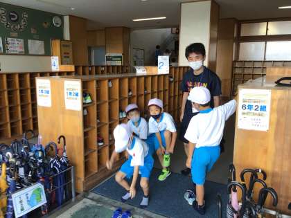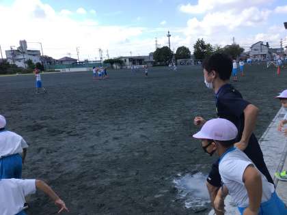 運動場を駆け抜けていきます。教育実習生の高根先生とおにごっこができるとみんな大喜びです。
