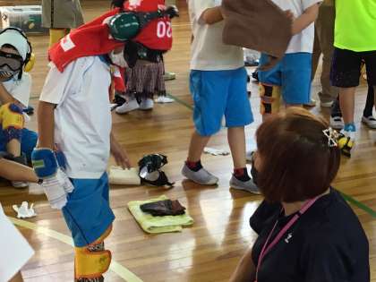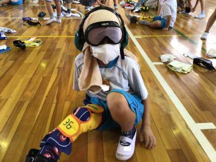 「障がいを理解するための実践教室」で、講師の先生方をお招きして、高齢者疑似体験を行いました。装具をつけて、お年寄りにはどんな不自由さがあるかを体験しました。