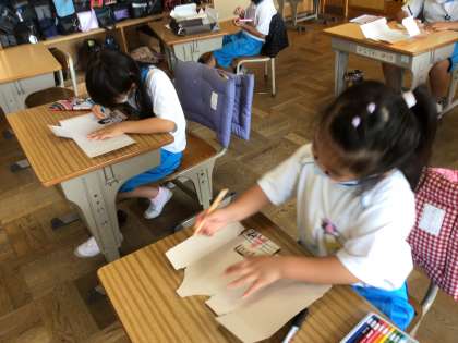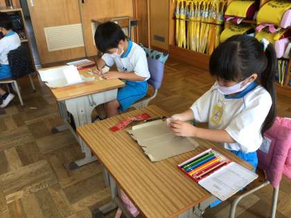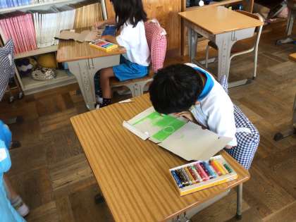 「いろいろなかたちのかみから」の学習で、はこをひらいて自分の考えた世界を描きました。形や素材から、想像をふくらませて描いています。