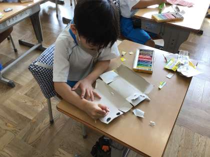 「いろいろなかたちのかみから」の続きです。クレヨンや色えんぴつ、名前ペンと、自分で書くものも選んで描いています。