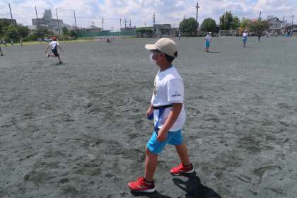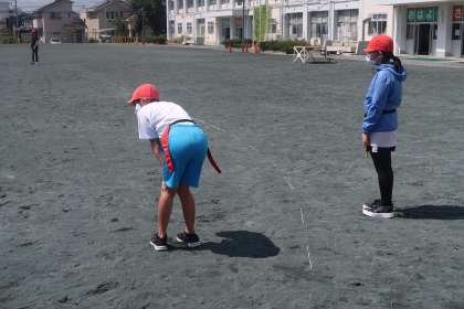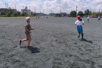 4組の学級レクリエーションの様子です。久しぶりに学級レクを行いました。前半はおにごっこです。トラックの中を走り回っていました。おにはタッチするのではなく、腰についているタグを取るのです。おににタグを2本とられた子は、トラックの外に出ます。