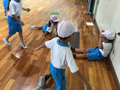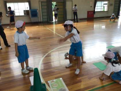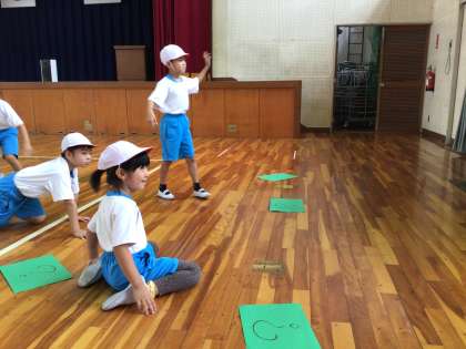 教育実習生の高根先生による公開授業です。授業が終わっても、「まだやりたい!」という子がいるほど、楽しんで表現リズム遊びをしているようでした。