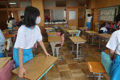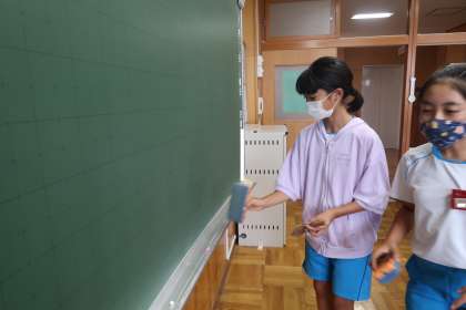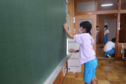 黒板は、黒板消しでチョークで書かれた後をきれいに拭きとります。チョーク置き場は、ミニほうきできれいにチョークの粉を除き、最後は水を濡らした雑巾できれいに拭きとります。