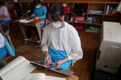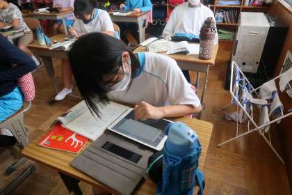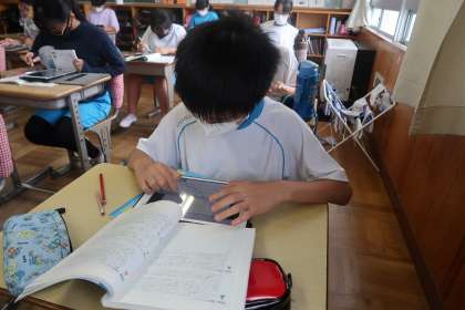 学習用タブレットの発表ノートに、投稿内容をまとめています。