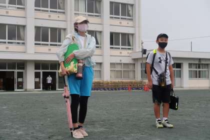今日の下校の様子です。2組の学級委員が熱く語っていました。小雨が降ってきていました。