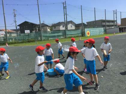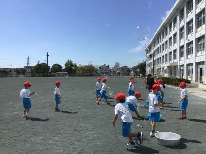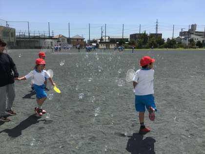 しゃぼん玉、リベンジです!今日は、前回よりも 大きくたくさん出るように、工夫しました。