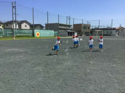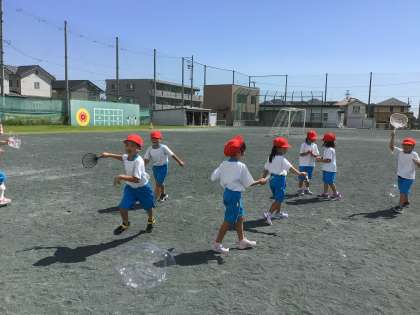 運動場を しゃぼん玉いっぱいにしようと、みんなで走りました。いっぱいになったかな?