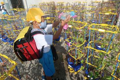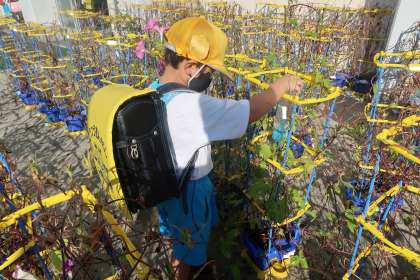 1年生の朝の様子です。花が咲いているアサガオに水やりをしていました。今朝は、よい天気でした。