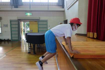 2組の体育の授業です。1組は午前中だったので涼しかったのですが、2組は午後の授業だったので暑くなり始めていました。同じく跳び箱の授業です。跳び箱の跳ぶ感覚をつかむ練習です。