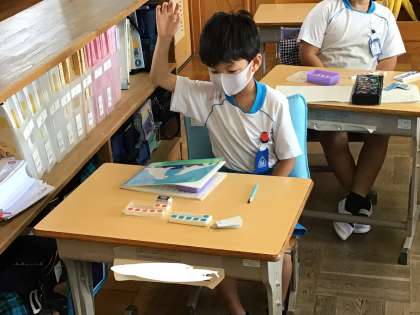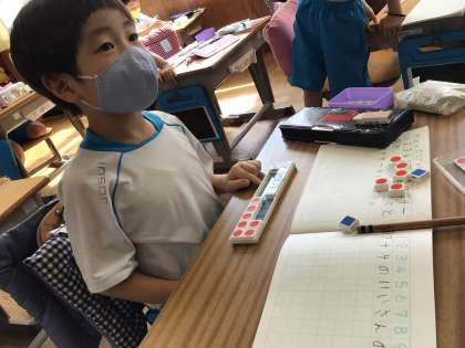 「たしざん2」の学習の様子です。計算の仕方を数図ブロックを使いながら説明しています。