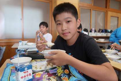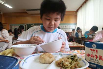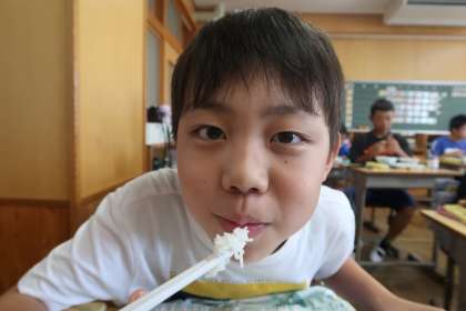 今日の給食の様子です。今日のメニューは、ご飯、牛乳、高野豆腐のうま煮、ゴボウ入りハンバーグ、おかか和えでした。今日も完食しました。