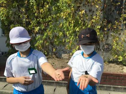 ツルレイシの様子が気になり、観察しにきました。 種をたくさん見つけ、喜んでいました。