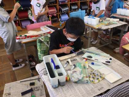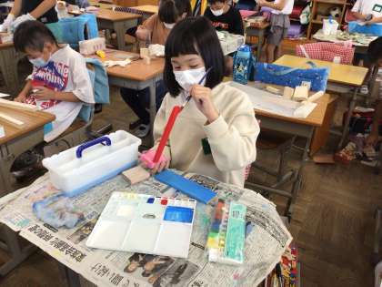 切り終わった木に、絵の具を使って丁寧に色を塗りました。