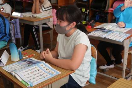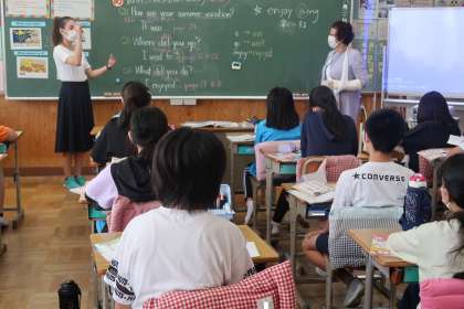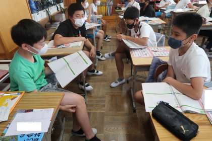 外国語の授業です。夏休みに楽しかった出来事を英語で表現していました。