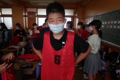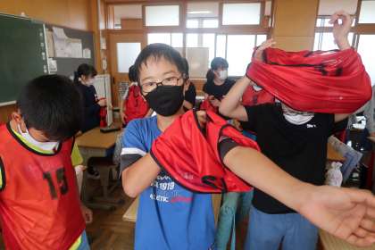 1組の学級活動の様子です。スポーツフェスタで使用するビブスのサイズ確認をしていました。