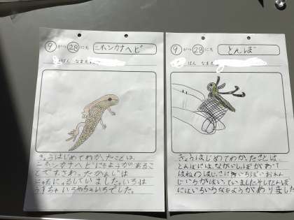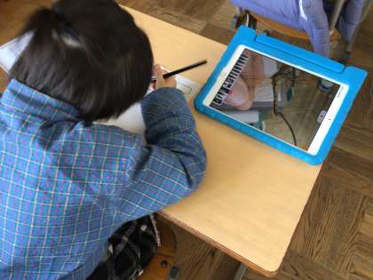 iPadの拡大機能を使って、生き物の様子を詳しく観察しています。次は秋ならではの生き物を観察したいですね。