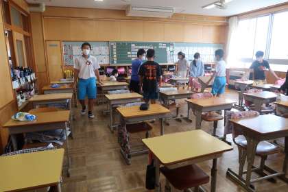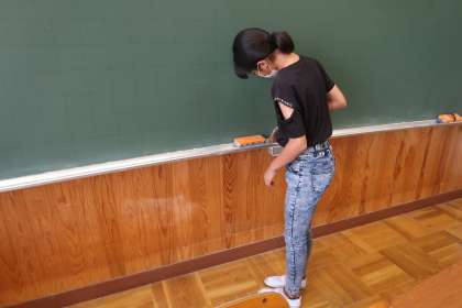 黒板のレールをミニホウキを使ってチョークの粉を集めていました。教室がきれいになりました。