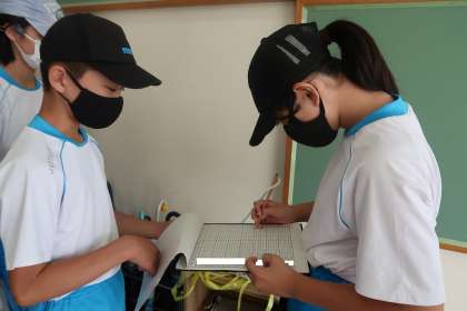 ボランティア後の様子です。名簿に○を付けています。今から教室に行くところです。今日もありがとうございました。