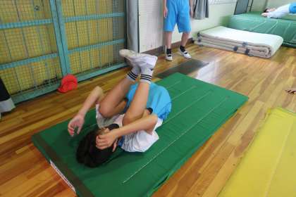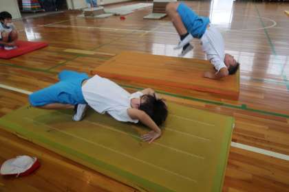跳び箱の技に生かすために、寝転がってから、起きる練習をしています。