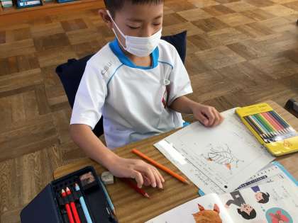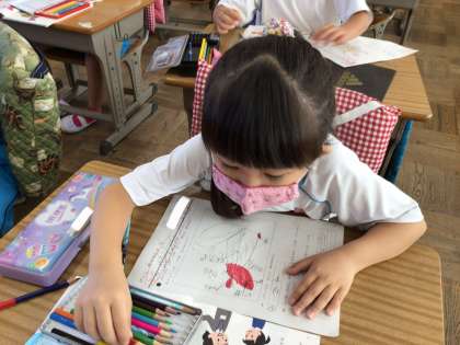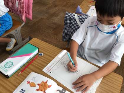 教科書に載っている写真をみて、自分だったら何に見えるか想像しています。