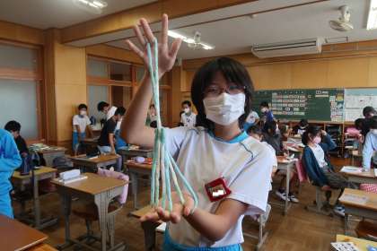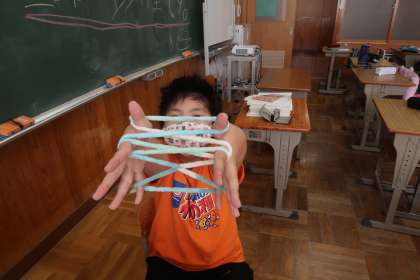 休み時間の様子です。あやとりをしている6年生です。とても複雑なものを作る子もいて感心しました。