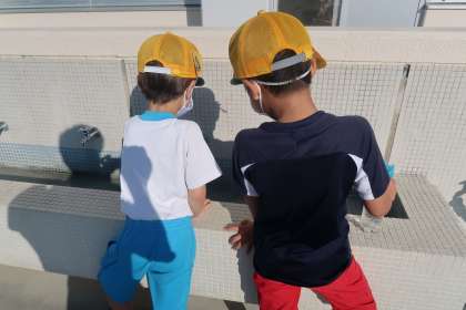 朝の様子です。今も毎日アサガオに水やりをしている子がいます。この日は、地面に漢字で「北海道」と書いてくれました。1年生も少しずつ漢字を書くことができるようになっているのですね。