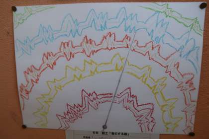 図工の作品です。「音のする絵」です。音の響きを絵で表現した作品です。階段の踊り場にある掲示板に飾ってあります。タイトルは、上から「葉っぱがこすれて、落ちる音」「心臓の音、ドッッックン」「いろんな足音」です。どれもこれも素敵な作品ばかりです。