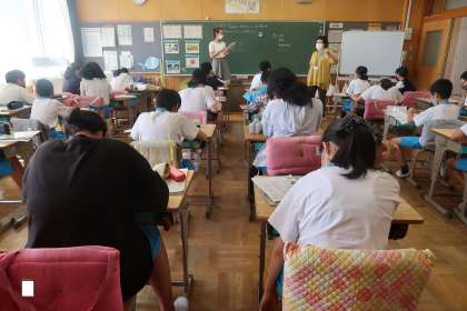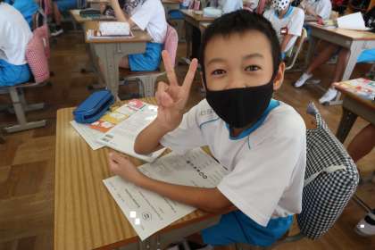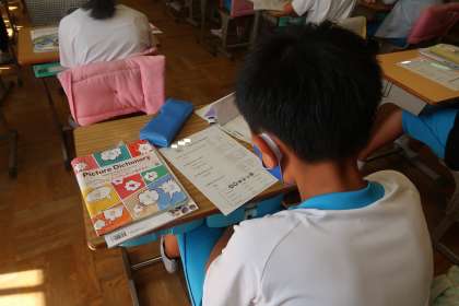 3組の外国語の授業です。夏休みの過ごし方を、英語で表現していました。夏休み中のことを一生懸命に思い出しながら考えていました。