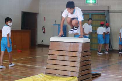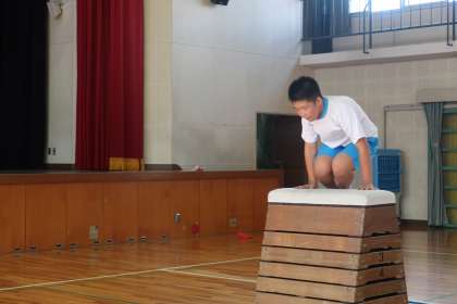 こちらは、抱え込み跳びをしているところです。膝をしっかり曲げて跳びます。縦向きの跳び箱で跳べる子もいました。