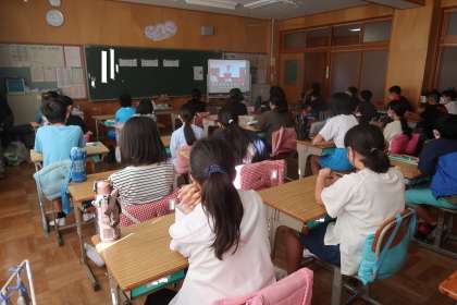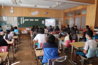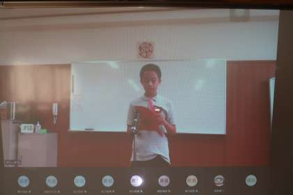 前期終業式の様子です。リモートで行われました。6年生の代表の子が、毎日、挨拶ボランティアを行ったことについて話をしていました。