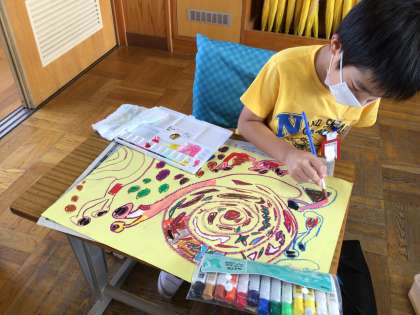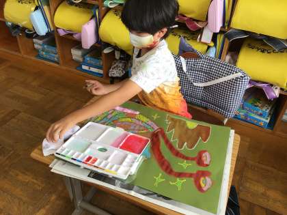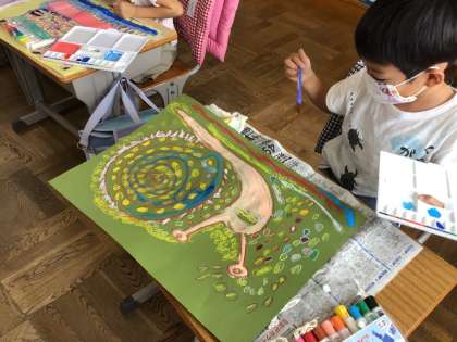 絵の具の使い方を思い出しながら、頑張って塗っています。