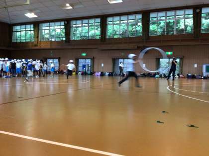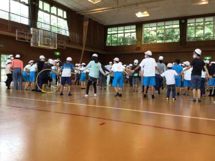 まずは、学級対抗フラフープくぐり!!