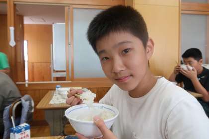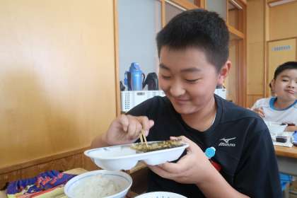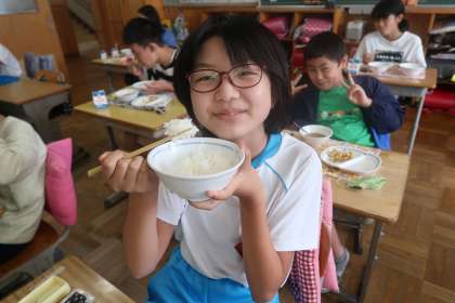 今日の給食の様子です。食べているときの子どもたちの笑顔が素敵ですね。今日も美味しくいただきました。