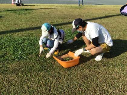 芝生の草取りを実施。
