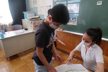 外国語の授業です。夏休みの出来事をALTの先生に英語で伝えています。